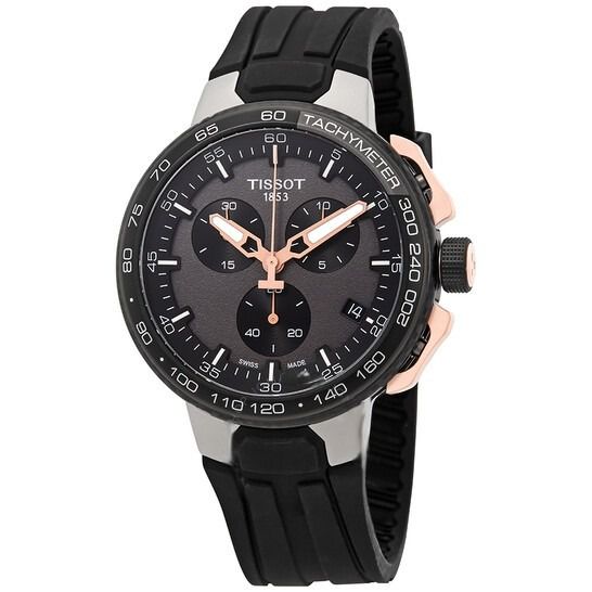 Caixa de aço inoxidável PVD de ouro preto e rosa com uma correia de silicone preta. Moldura fixa de alumínio preto mostrando marcas de taquimetro. Mostrador preto com mãos luminosas de tons dourados e marcadores de hora de índice. Marcadores minuciosos ao redor da borda externa. Tipo de discagem: Analógico. Mãos e marcadores luminescentes. Exibição de data na posição das 4 horas. Cronógrafo - três sub-mostradores exibindo: 60 segundos, 30 minutos e 1/10 de segundo. Movimento de quartzo ETA Calibre G10.212. Cristal de safira resistente a arranhões. Puxe / empurre a coroa. Caso sólido de volta. Forma de caso redondo. Tamanho da caixa: 44,5 mm. Espessura da caixa: 11,4 mm. Largura da banda: 18 mm. Tang fecho. Resistente à água a 100 metros / 330 pés. Funções: cronógrafo, rattrapante, data, hora, minuto, pequeno segundo. Estilo de relógio esportivo. Etiqueta de relógio: Swiss Made. Tissot T-Race Cronógrafo Black Dial Men's Watch T111.417.37.441.07.